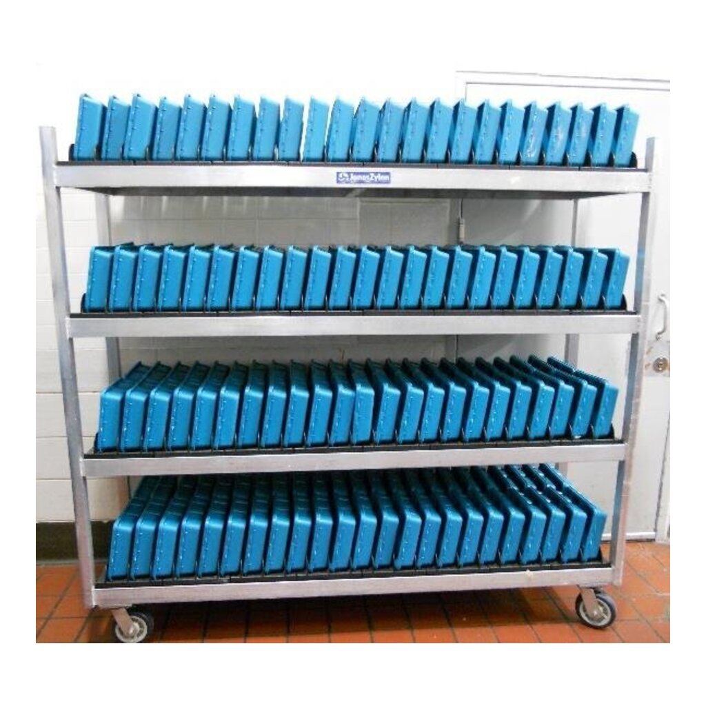 ASPS-DR-JZDRA-156/92Components: Shelves · Four shelves · Eight inserts per shelf, thirty-two inserts per rack · Interchangeable inserts -- mix and match Casters Four 6” poly swivel casters with brakes Construction/Material: · Sturdy construction specifically designed for the demanding corrections environment · All fasteners are tamper-proof · Type 6063-T5 aluminum alloy with wall thickness of 0.070”. Inserts: § Dishwasher safe, temps up to 212° § Shatterproof and resists sharpening JZDRI-3 · 3” slots (for seg & insulated trays) · 23 slots per shelf, 92 per rack JZDRI-4 · 1.125” slots (for lids, sheet pans) · 55 slots per shelf, 220 per rack JZDRI-5 · 1.813” slots (for cafeteria trays) · 39 slots per shelf, 156 per rack